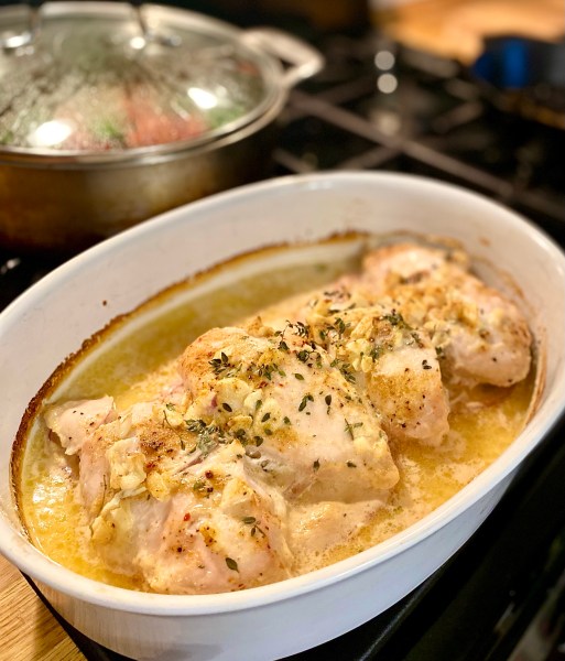 Slice a red onion thinly and place rounds of it on the bottom of a greased baking dish. Place four large chicken breasts on top of the onion rounds, then cover the chicken with chopped garlic (I used at least seven to eight cloves). Add a large tablespoon of butter on top of each chicken breast, then generously season them with salt and steak seasoning. Pour about a half cup of heavy cream on and around the chicken, then about a half cup of the chardonnay. Sprinkle some fresh thyme on top. Bake at 400 for roughly 25 minutes, or until it’s bubbling and the chicken is not pink in the middle.