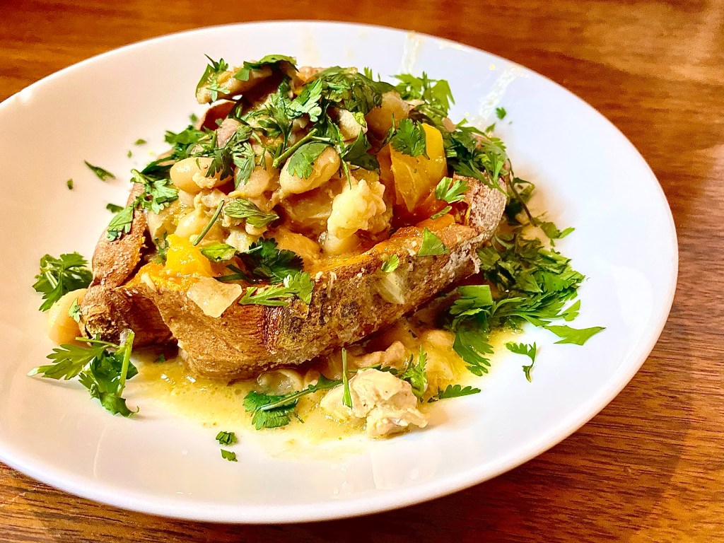 This might be my favorite new chicken recipe. While there are many white chicken chili recipes out there, somehow I’ve never made it until this week. I decided to use this version as a sweet potato topping, but it would be good on its own or rolled into a tortilla as a taco or enchilada.