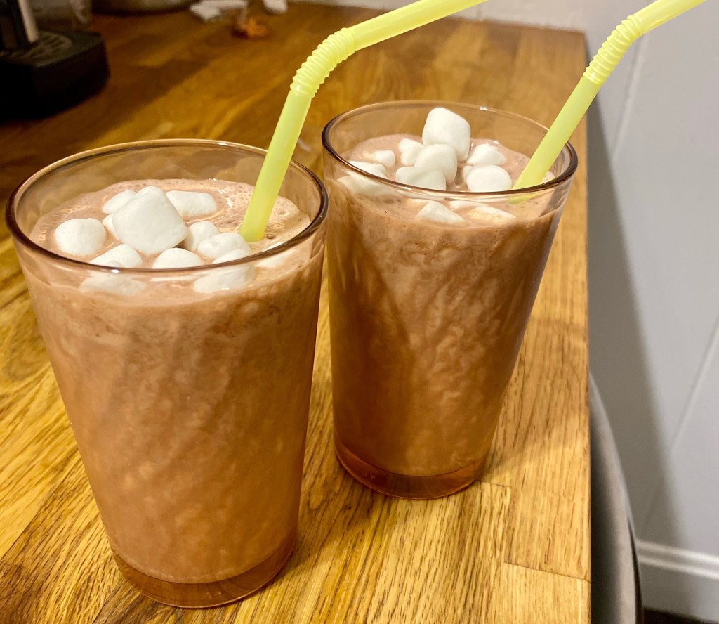 Blend! This makes three 8 oz servings or four 6 oz servings. I also added a couple of marshmallows for my kiddos.