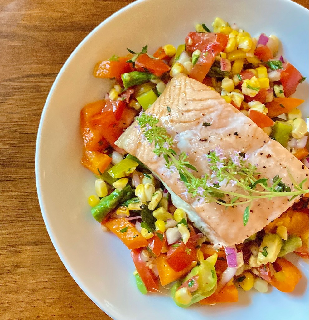 Need a fresh salmon and salad idea for your summer menu? Try this corn salad I paired with baked thyme salmon: