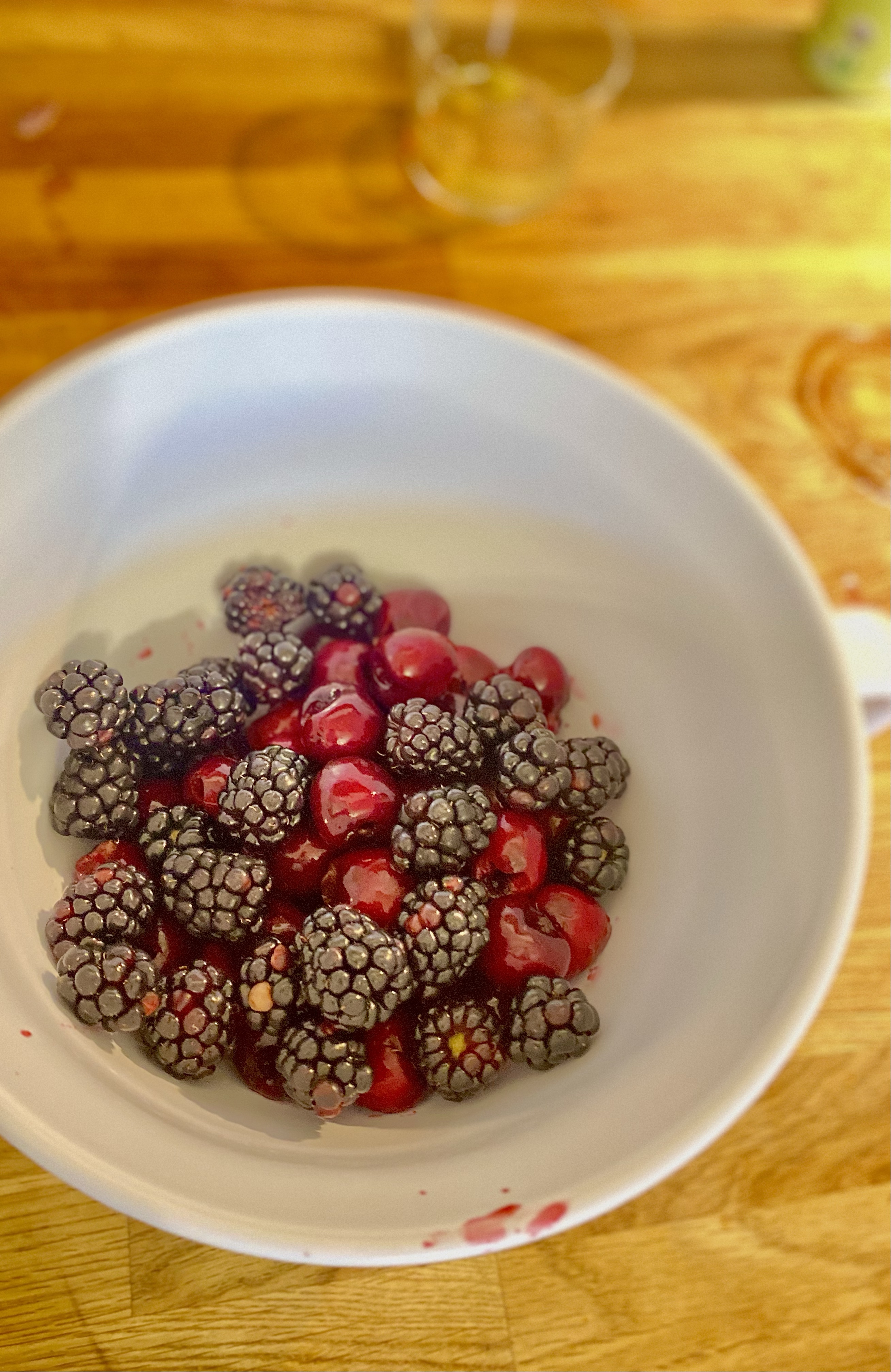 Last night I made what I’ll call a lazy galette… lazy because I used a store-bought crust but I’ll tell you the cherry-blackberry combo made up for it! Recipe below: