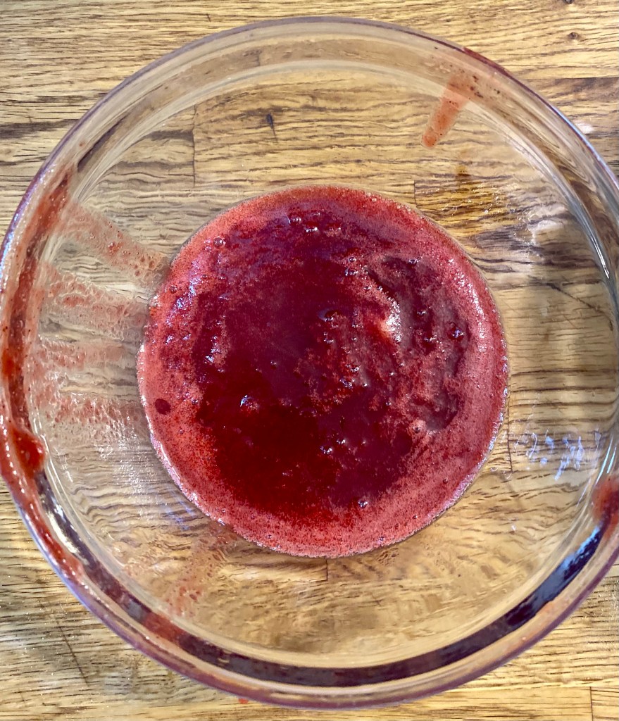 Give it a stir and let it simmer on low for about ten minutes, or until it has the consistency of a slightly drippy cranberry sauce. Before it cools, strain the juice into a bowl, and let it sit.