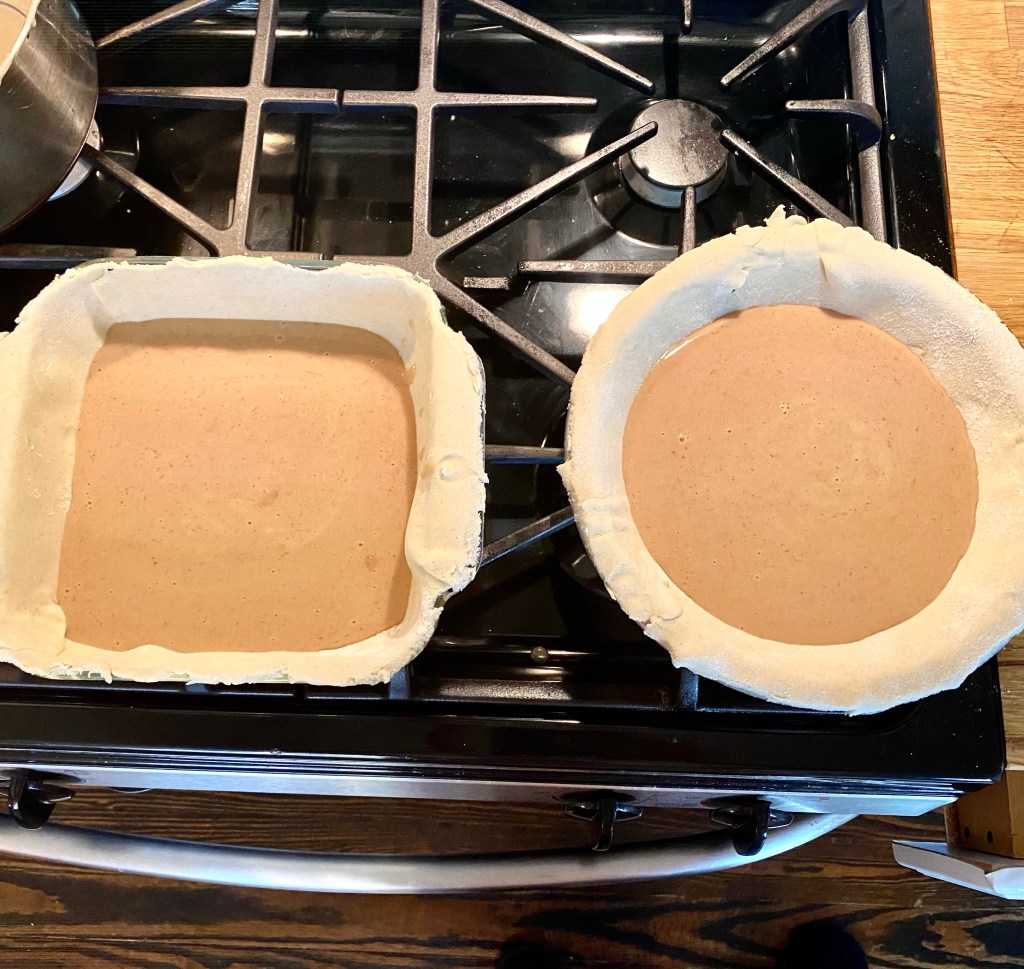 I separated my crust into two pie pans, but you could make one larger one. It sets up quicker if you make two smaller pies. Once you’ve lined your pans with the crust, pour the custard mix in. Place the pie(s) into the oven and bake at 350 for ten minutes. Let the pies cool for about 20 minutes, or until room temp.