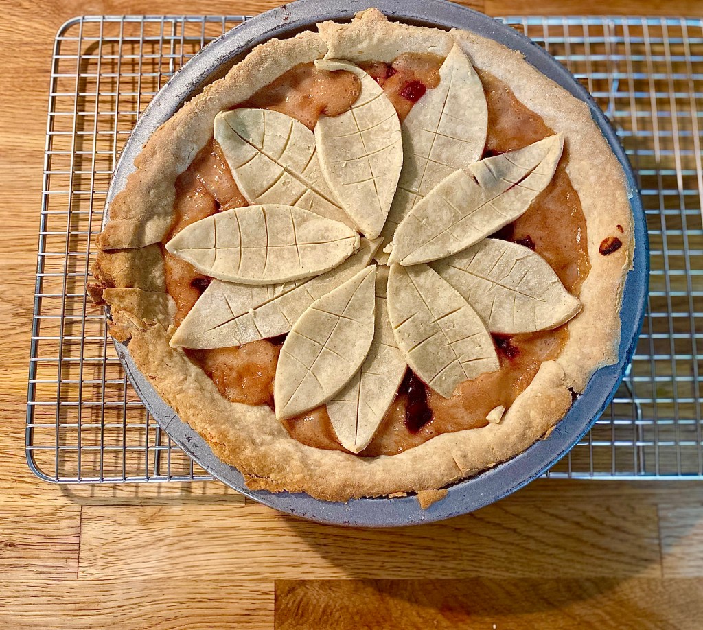 Last but not least, roll out the last bit of dough and cut it into simple leaf shapes, dropping them onto the top of the pie in a circle. Bake at 400 degrees for 20 minutes. Allow to cool thoroughly, at least two hours before slicing.