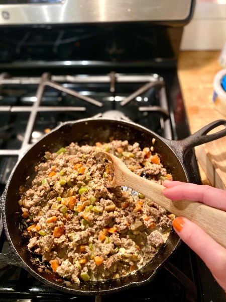 - Sauté the chopped onion in the avocado oil about three to four minutes on medium-high heat, until it is translucent. Add the beef or lamb, salt and pepper, chopped celery and chopped carrots, salt and pepper. Sauté until the meat is just browned, but not cooked all the way. Add the cream and mix thoroughly, then add the garlic and herbs. Turn off the heat.